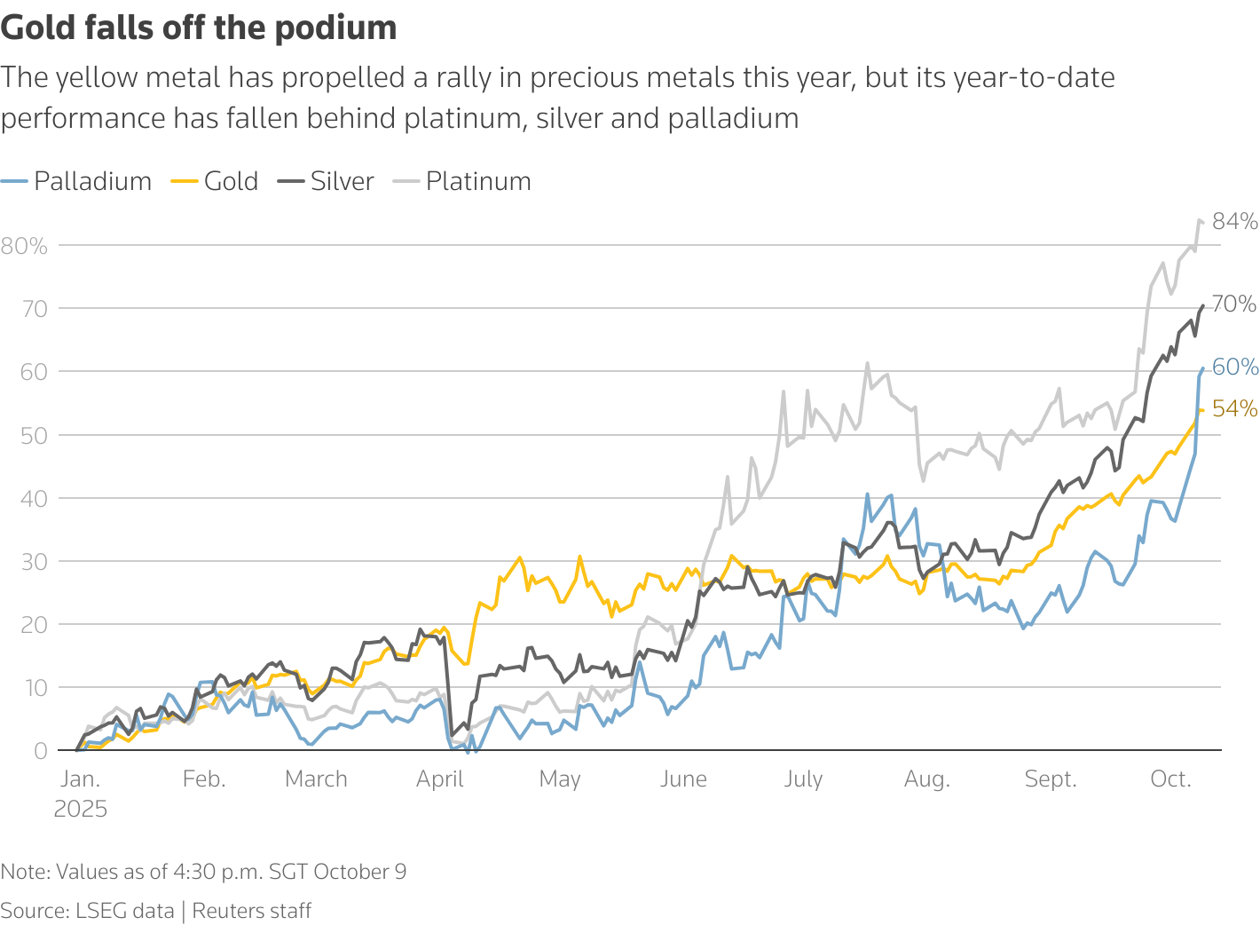 Palladium is also seeing strong gains, ~60 % year to date. (Reuters)