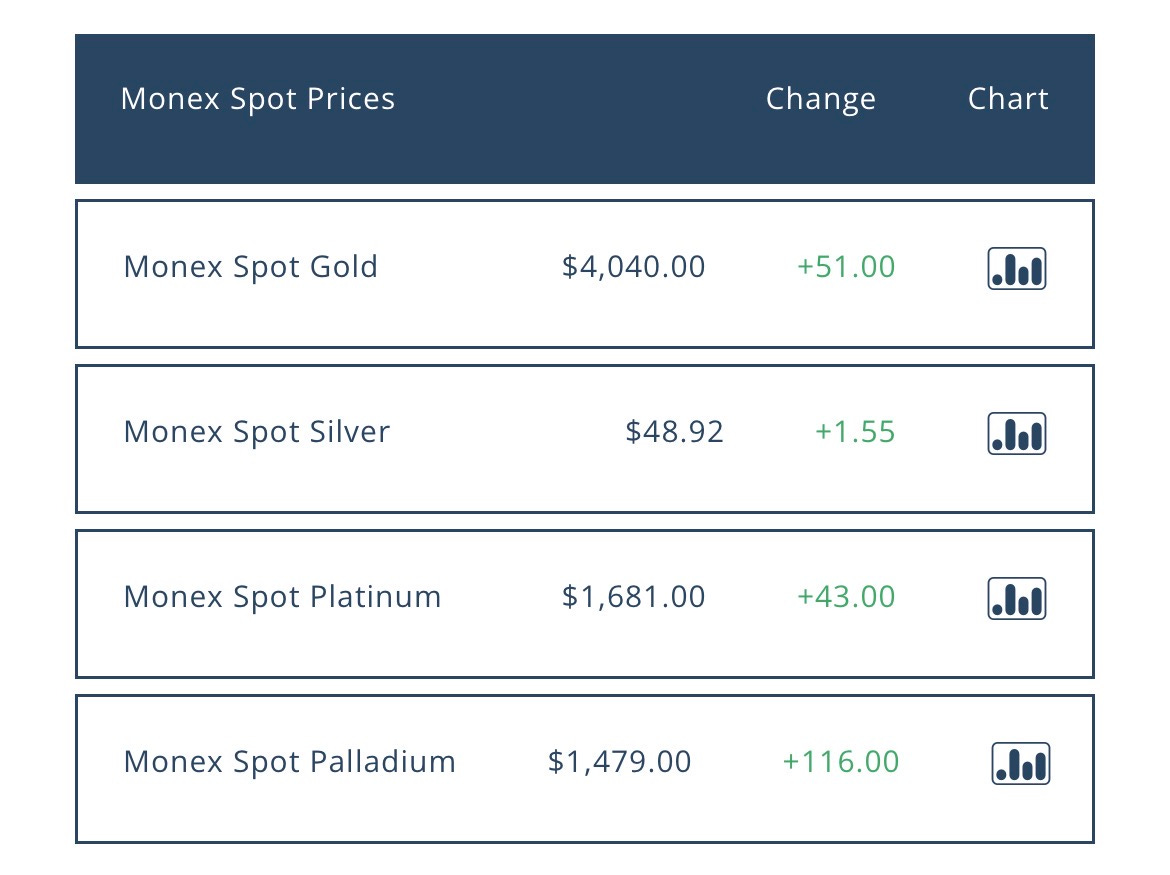 Current spot prices (approximate): Gold $4,037/oz; Silver $49.58/oz; Platinum $1,667/oz; Palladium $1,456/oz. (Kitco)